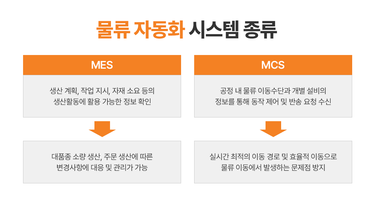 제조업계에서 제품 생산 시간을 최소화하는 방안으로 물류자동화 시스템에 MES(Manufacturing Execution System)와 MCS(Material Control System)를 적용하는 방법이 있습니다.