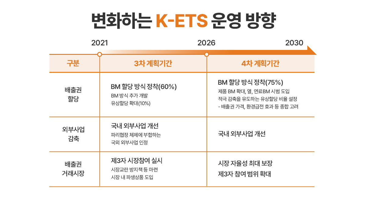 전 세계적인 탄소 규제 강화의 움직임은 국내에도 영향을 미치며, K-ETS(한국 온실가스 배출권 거래제)의 변화를 불러왔습니다. 2015년부터 시작된 K-ETS는 1차 계획기간을 지나 다가올 2026년부터는 4차 계획 기간을 맞이할 것을 예고하고 있습니다. 유상 할당 확대와 BM 할당 방식의 고도화, 그리고 국내 외부 사업 개선 등의 제도 개편이 예정되어 있으며, 이를 통해 기업의 온실가스 감축 목표 달성을 유도할 것으로 계획되고 있습니다.