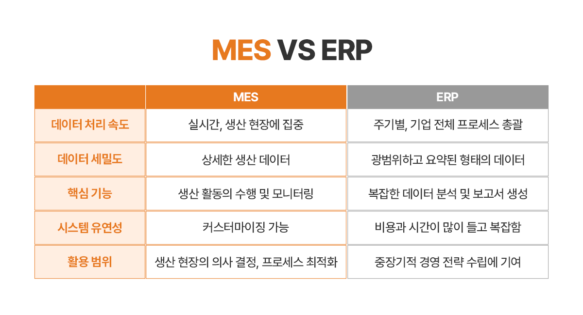 MES는 상세한 생산 데이터를 다루는 반면, ERP는 MES와 달리 일일 생산량, 월간 재고, 분기별 매출 실적 등 더 광범위하고 요약된 형태의 데이터를 다룹니다. MES는 생산 프로세스의 세밀한 최적화에, ERP는 전사적 자원 배분 및 전략 수립에 더욱 효과적입니다.