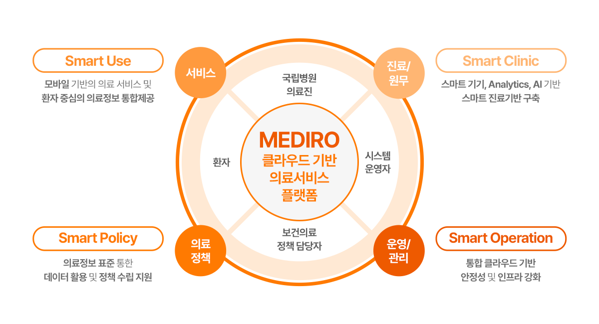 현재 의료 AI 시장은 디지털화와 클라우드 기술의 발전을 바탕으로 빠르게 성장하고 있습니다. 국내 병원도 스마트 병원 추진을 위해 디지털 헬스케어 분야의 다양한 사업을 수행 중이며, 실제로 선도 모델이 등장해 놀라운 성과를 이루고 있습니다. 그중 차세대 국립병원 정보시스템(MEDIRO)은 9개 국립병원의 의료 정보를 클라우드 환경에서 통합 관리하여 의료 서비스 품질과 효율성을 크게 높이고 있습니다. 특히 빅데이터와 AI 분석 기술이 결합된 모바일 EMR(Electronic Medical Record; 전자 의무 기록)과 CLMA(Closed Loop Medication Administration) 등의 시스템을 통해 환자 정보를 실시간 모니터링하여, 신속하고 정확한 진료를 가능하게 합니다.