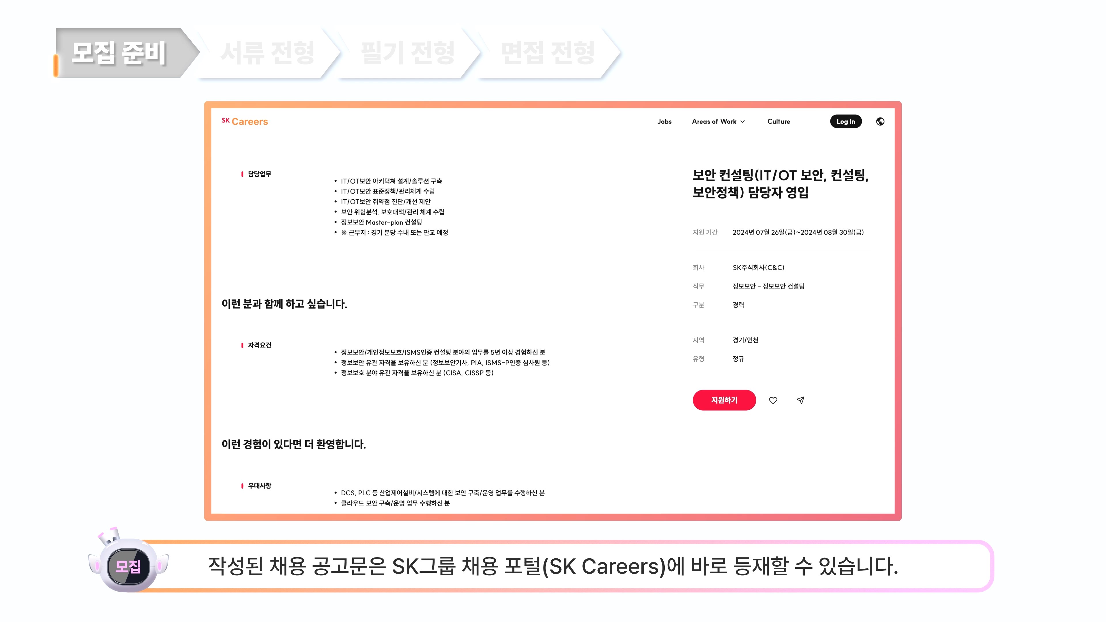 조기수 팀장은 기존에 사업부가 작성한 JD(Job Description)에 HR팀이 인재상을 결합하여 공고문을 완성했지만, 이제는 Gen.AI 기반 프롬프팅 기술을 활용하여 이를 자동으로 생성할 수 있다고 말했습니다. 더 나아가, SK Careers 플랫폼과 API 연동을 통해 채용 공고문 자동 게시는 물론 실시간 지원 현황 모니터링도 가능한 형태로 시스템을 고도화하고 있다고 덧붙였습니다.