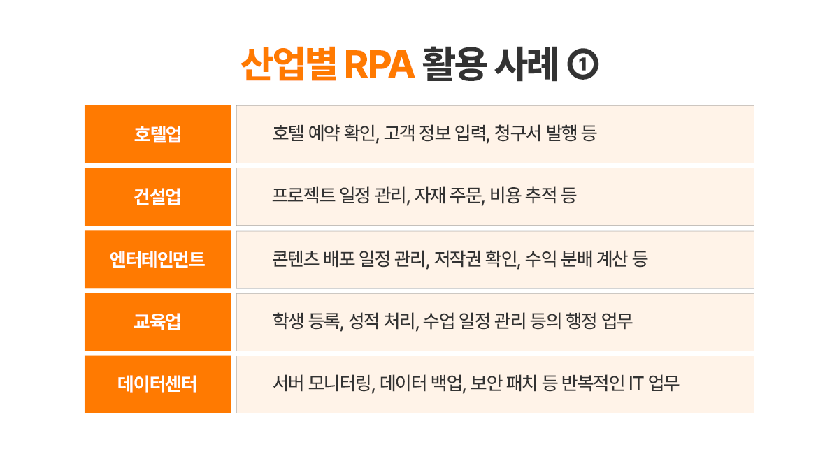이처럼 RPA는 호텔, 건설, 의료, 미디어 등 다양한 산업에서 생산성과 효율성을 높이는 핵심 기술로 자리 잡고 있으며, 각 업계의 특성에 맞게 지속적으로 진화하고 있습니다.