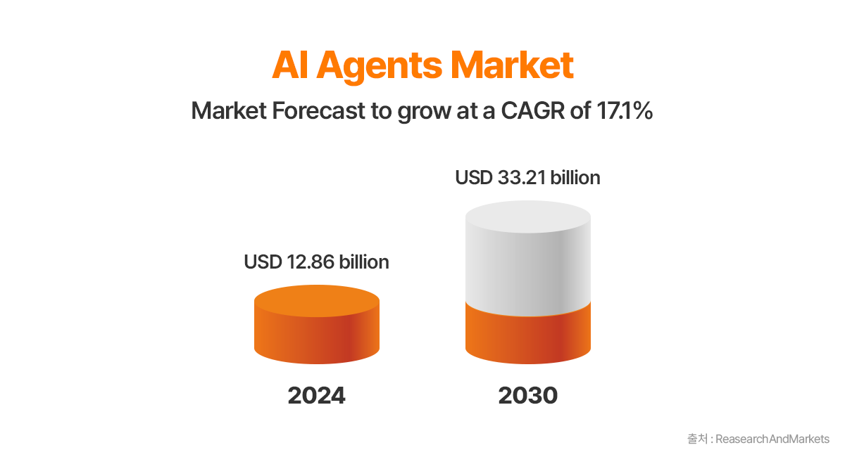 뜨거운 업계 유명 인사들의 관심만큼이나 기업들의 AI 에이전트를 향한 기대감과 투자 규모 역시 확대되고 있습니다. 시장조사업체 리서치앤드마켓은 글로벌 AI 에이전트 시장이 2024년 128억6000만달러(약 18조6500억원)에서 오는 2030년 332억1000만달러(약 48조1600억원)까지 성장할 것으로 전망했습니다.