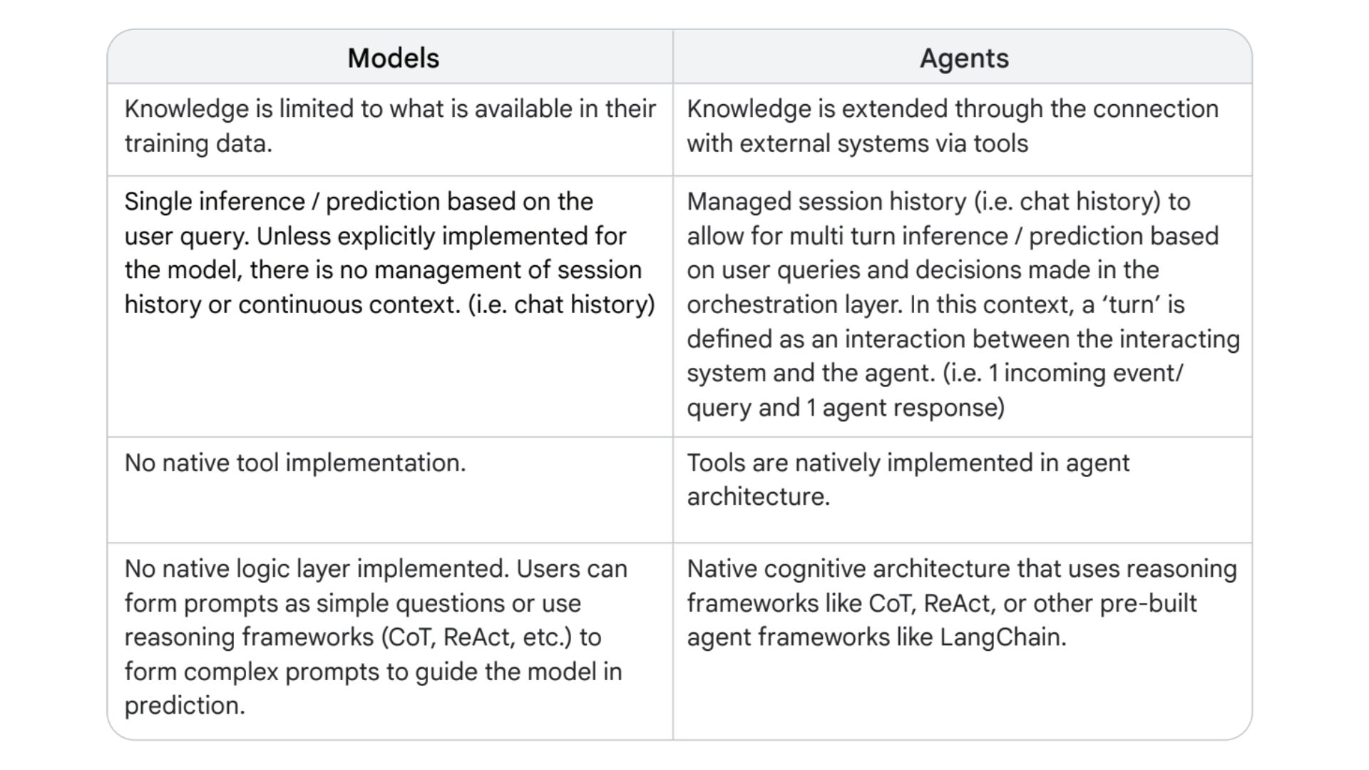 기존의 LLM과 AI 에이전트의 차이점은 그뿐만이 아닙니다. 구글의 에이전트 백서에 따르면. LLM을 탑재한 AI 에이전트는 여러 가지 툴과 로직들을 활용해 훈련 데이터(training data)에 없는 정보를 외부 시스템이나 툴을 통해 얻을 수 있으며, 이를 바탕으로 항상 최신의 상태로 유지할 수 있다는 점에서 기존의 LLM보다 훨씬 더 진보한 기술이라고 할 수 있습니다.