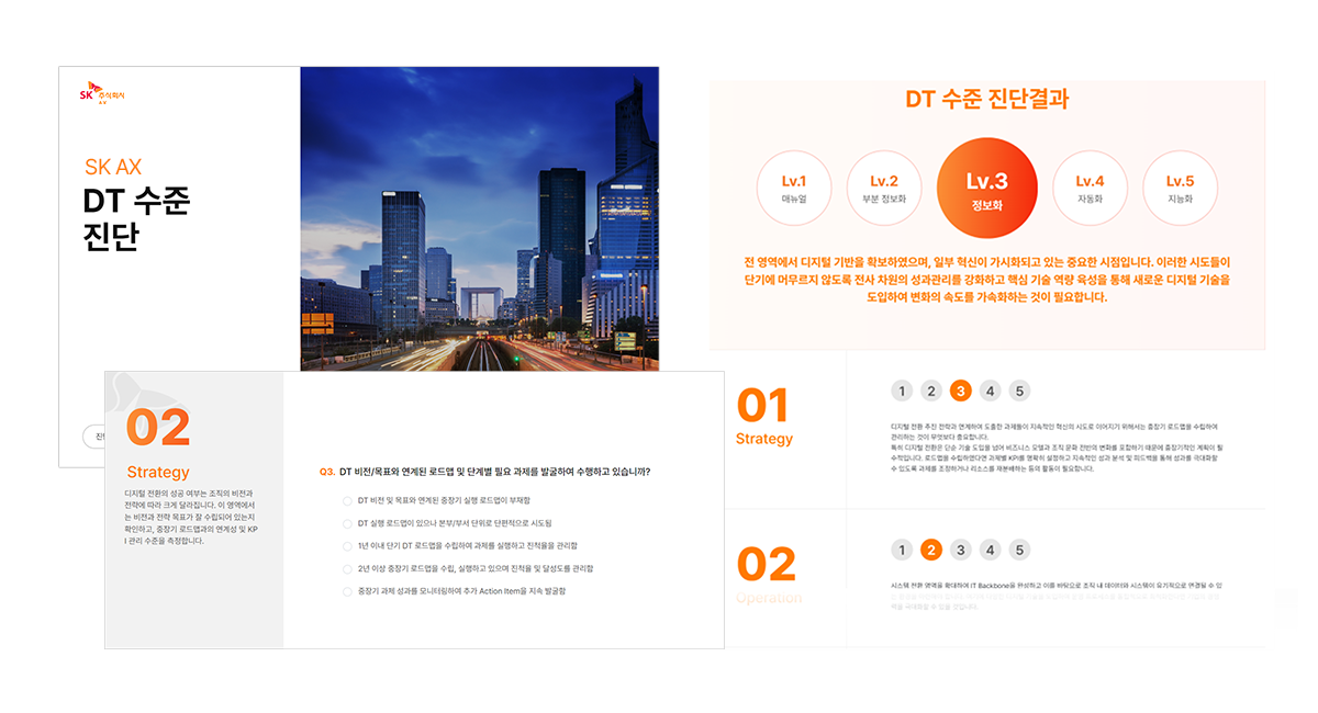 디지털 전환(Digital Transformation, DT)은 단순한 기술 도입이 아니라 조직 전체의 전략, 운영 방식, IT 인프라까지 아우르는 근본적인 변화 과정입니다. SK AX의 DT 수준 진단 서비스는 글로벌 Best Practice를 기반으로 구축된 진단 프레임워크를 활용하여 기업의 디지털 전환 수준을 구조적으로 분석하고, 최적의 개선 방향을 제시합니다.