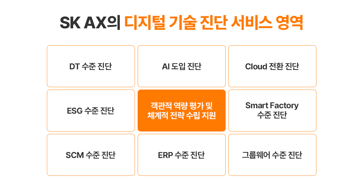 SK AX의 디지털 기술 진단 서비스는 이 8가지 진단 영역을 기반으로 단편적인 문제 해결을 넘어, 전사적으로 디지털 혁신을 추진할 수 있는 기반을 마련합니다.