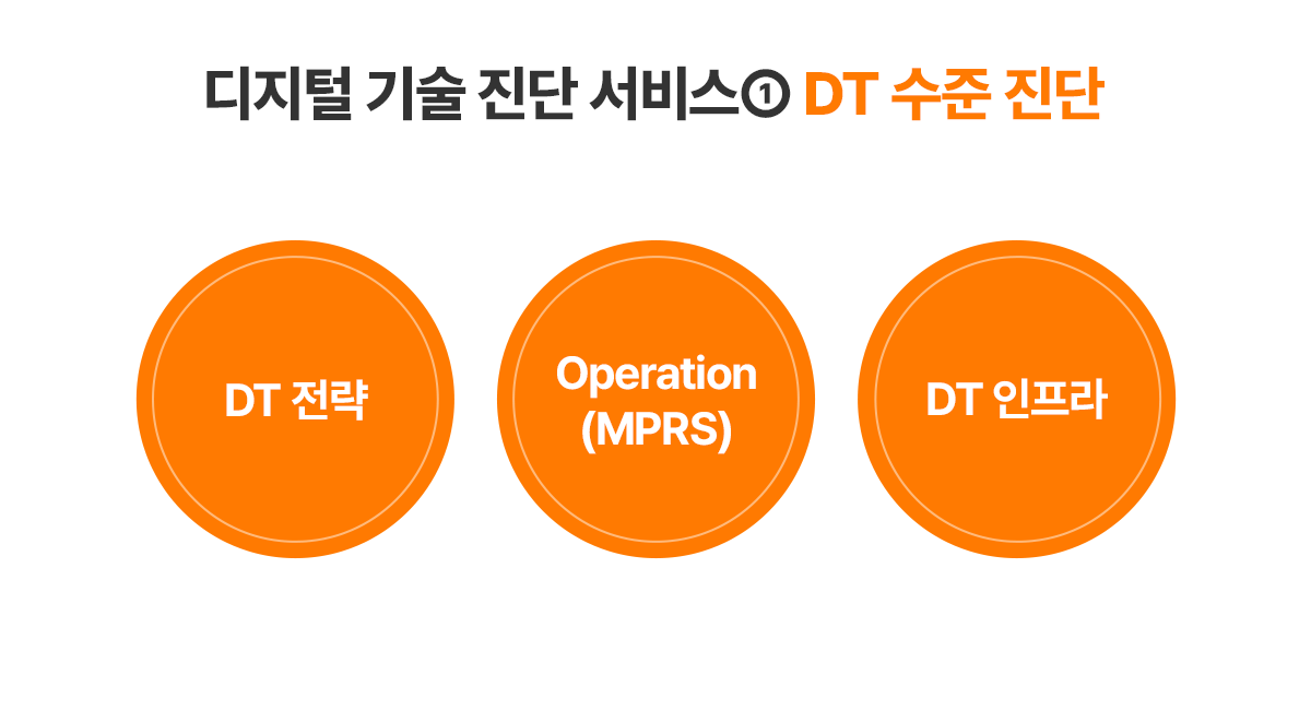 이 진단 서비스는 DT 전략, 운영(마케팅·생산·연구개발·지원), DT 인프라의 세 가지 주요 관점에서 기업의 현황을 평가하며, 각 영역별로 구체적인 문제점을 도출하여 기업이 디지털 전환을 효과적으로 추진할 수 있도록 지원합니다.