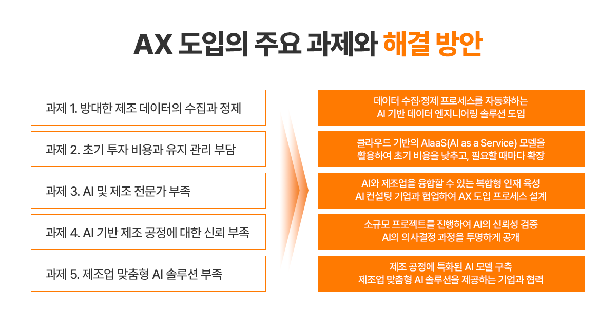 이를 해결하려면, 기업 내부적으로 AI와 제조업을 융합할 수 있는 복합형 인재를 육성하고, AI 솔루션을 쉽게 활용할 수 있도록 사용자 친화적인 인터페이스(UI)를 제공하는 AI 플랫폼을 도입하는 것이 중요합니다. 또한, 외부 AI 컨설팅 기업과 협업하여 AX 도입 프로세스를 체계적으로 설계하는 것도 효과적인 방법입니다.