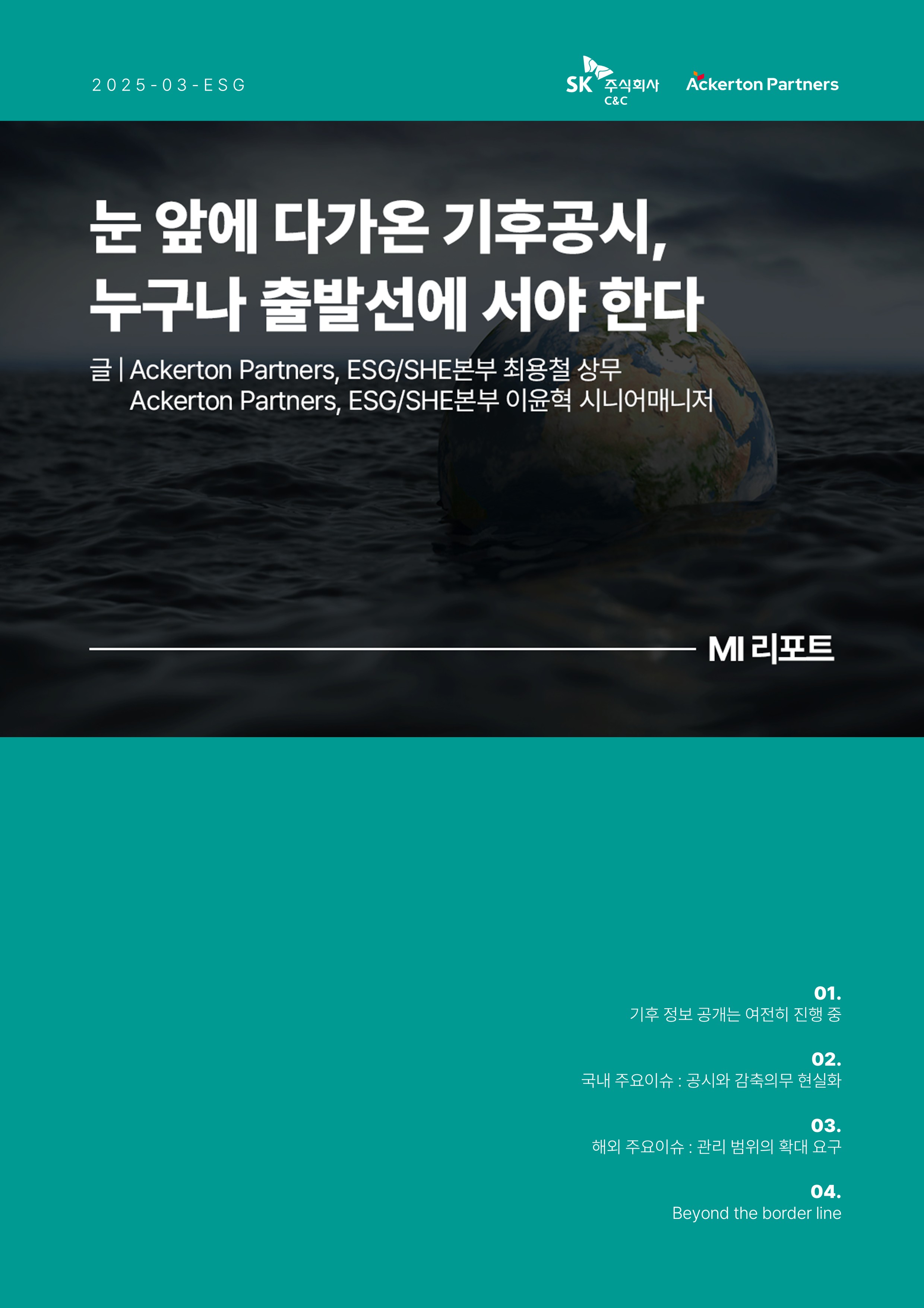 기후 정보 공개와 온실가스 감축을 둘러싼 변화의 물결 속, 모든 기업이 같은 출발선에서 ESG 경영 이행을 위한 준비를 시작하고 있습니다. 차별화된 관리 역량을 바탕으로 새로운 경쟁력을 확보하기 위해 기업은 어떤 준비를 해야 할까요? SK㈜ C&C의 MI 리포트에서 국내/외 주요 이슈를 살펴보고 장기적 탄소중립 목표 달성을 위한 전략을 구축해 보세요.