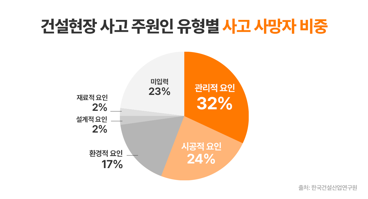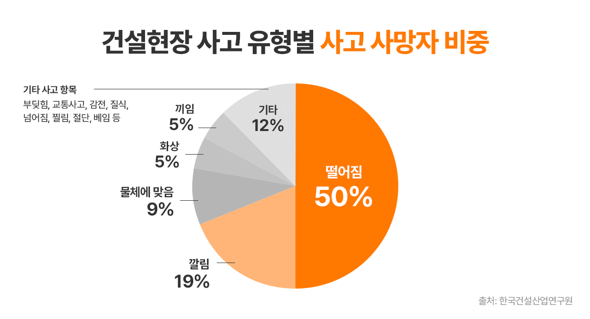 즉, 건설현장에서 발생하는 절반 이상의 사망 사고가 추락으로 인해 발생하고 있으며, 무거운 자재와 장비를 다루는 작업의 특성상 낙하, 깔림, 끼임 사고가 지속적으로 발생하고 있는 것입니다.