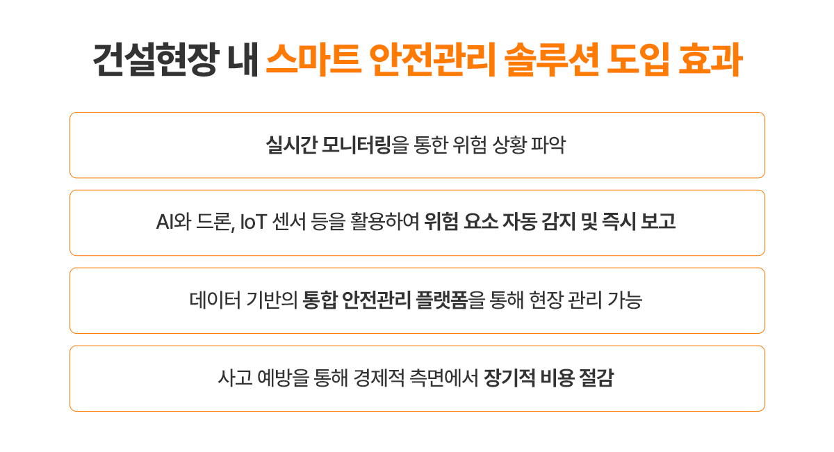 이제 건설현장의 안전관리는 인적 감시와 수기 보고만으로는 한계에 다다랐으며, AI, IoT, 빅데이터 등 첨단 기술을 활용한 스마트 안전관리 솔루션의 도입이 재해 예방, 비용 절감, 법적 리스크 대응을 위한 필수 전략으로 자리 잡고 있습니다.