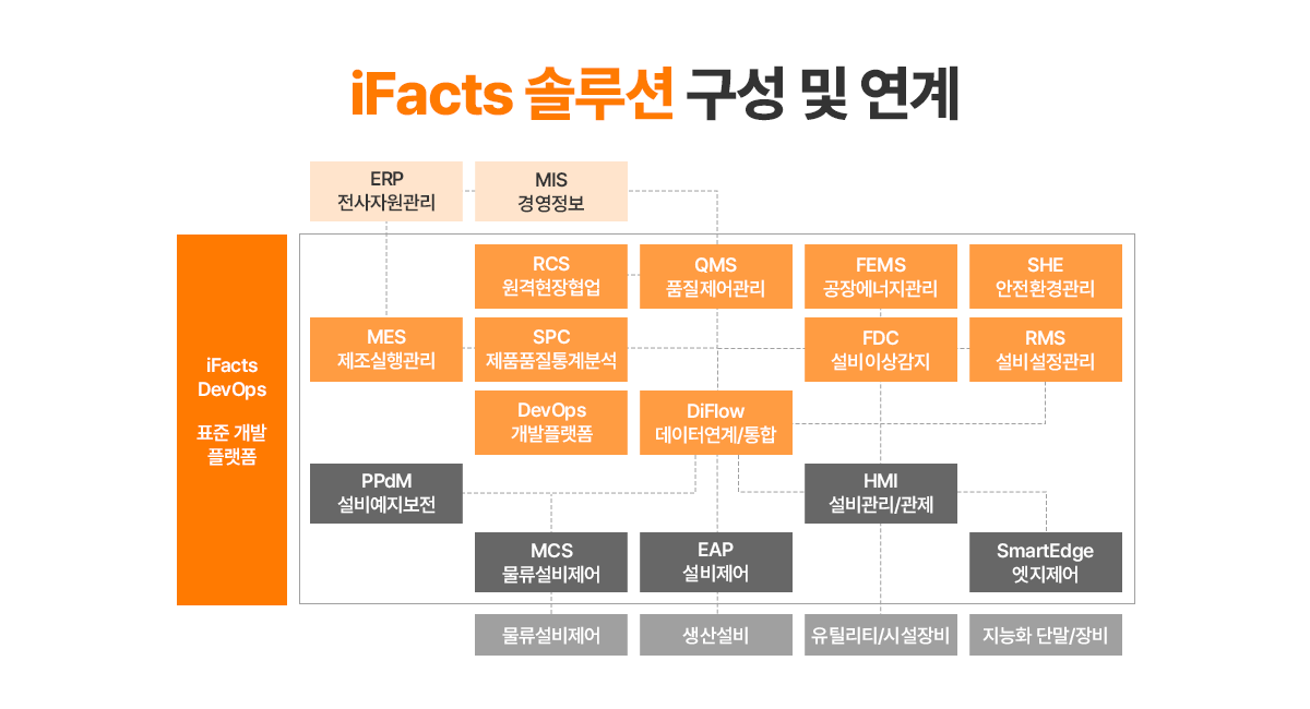 iFacts는 단일 시스템이 아닌 모듈화 된 구조로 구성되어 있어 고객의 환경과 요구에 따라 유연하게 적용할 수 있다는 점에서 높은 실용성과 확장성을 제공합니다. 이를 통해 기업은 생산성과 품질을 동시에 향상시킬 수 있을 뿐만 아니라, 글로벌 사업 확장을 위한 표준화된 운영 기반을 마련할 수 있습니다. 또한 실시간 데이터 수집과 분석을 바탕으로 보다 정밀한 의사결정을 지원하고, 공정 자동화와 운영 효율화를 동시에 실현할 수 있는 기반을 갖추게 됩니다.