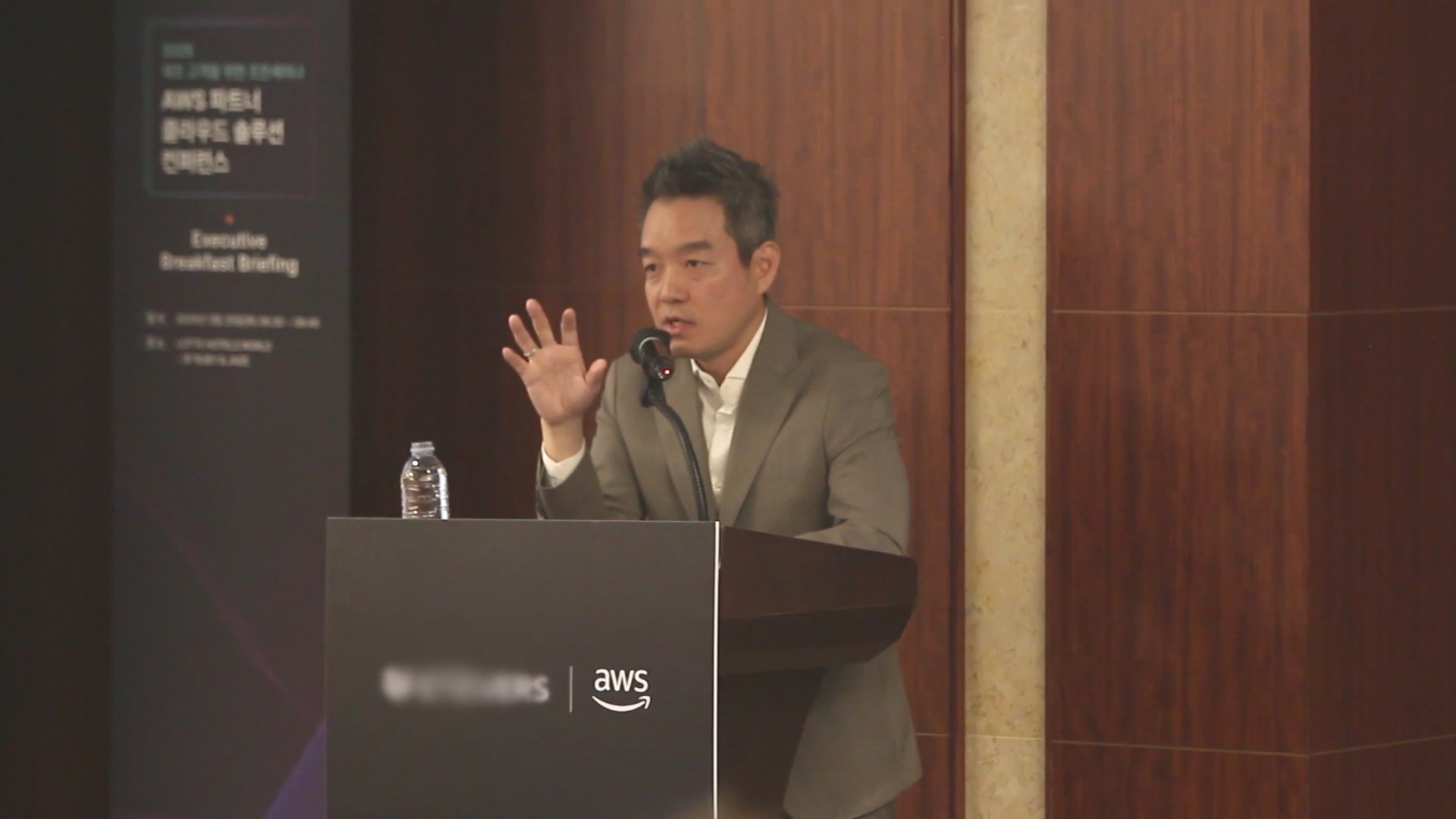 본격적인 컨퍼런스가 시작되기에 앞서, AWS는 제조 산업의 주요 C-Level 임원들을 대상으로 비공개 조찬 세션을 마련하였습니다. 이 자리에서 SK㈜ C&C의 김민혁 제조/글로벌사업 부문장은 ‘제조 산업 전략과 글로벌 진출을 위한 디지털 지원 방안’을 주제로 발표를 진행하였습니다.