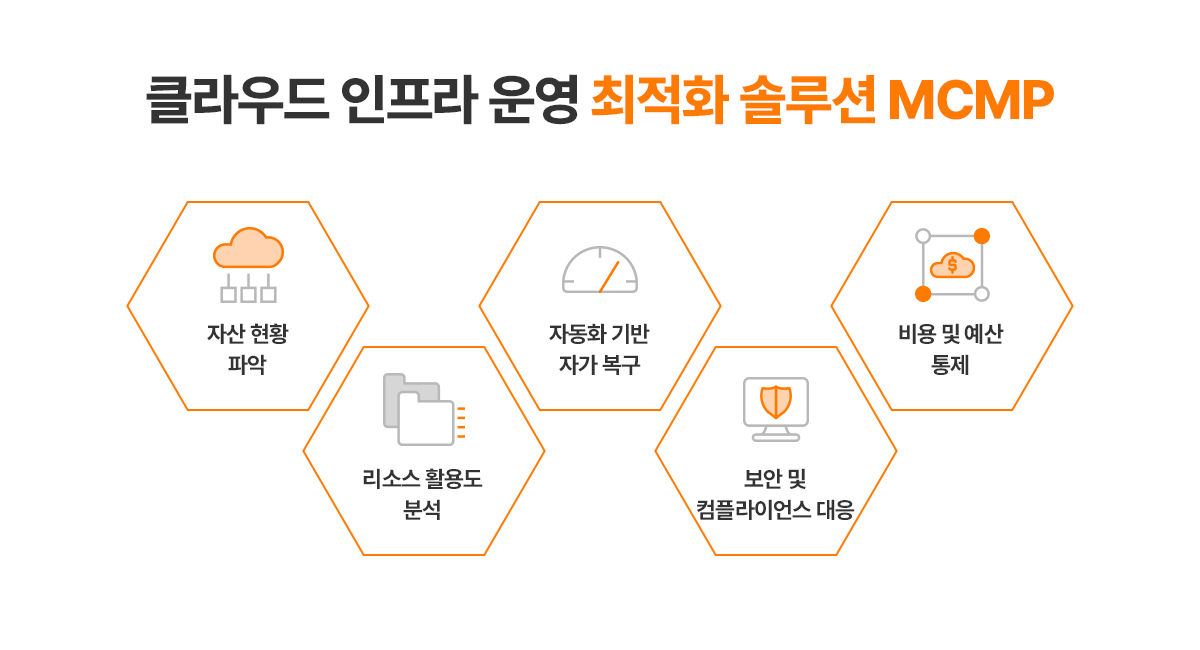 MCMP는 자산 현황 파악, 리소스 활용도 분석, 비용 및 예산 통제, 보안 및 컴플라이언스 대응, 운영 서비스 품질관리, 자동화 기반의 자가 복구 등 클라우드 인프라 운영에 필수적인 기능을 폭넓게 제공합니다. 특히 고객사별 표준 정책을 일관되게 적용하고, 반복적인 청구서 처리 문제를 해소하며, 복잡한 비용 구조의 원인을 분석하는 데에도 효과적인 해법을 제시합니다.