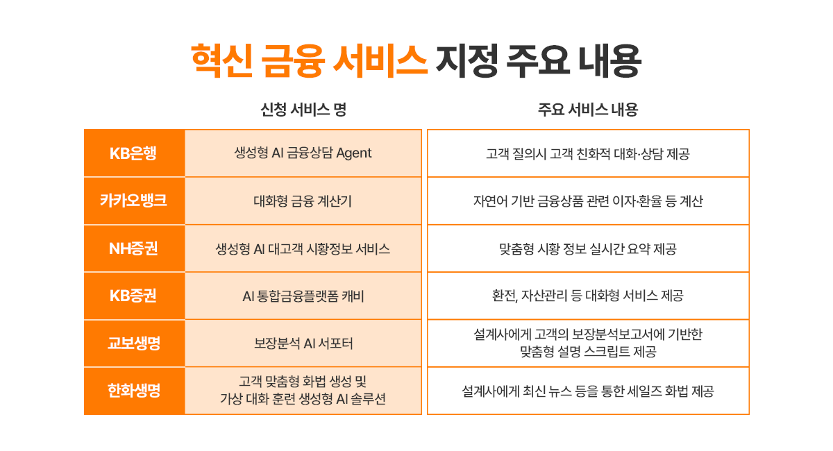 지정된 서비스는 은행, 증권, 보험, 카드 등 다양한 업권에서 출발했으며, 그 활용 방식도 각기 다릅니다. 예를 들어, 신한은행은 자연어 기반의 AI 은행원을 통해 금융 상담과 외국어 번역 서비스를 제공하고 있으며, 고객의 질문에 대해 뉴스 요약이나 시장 흐름 정보를 자연스럽게 전달하는 투자 Q&A 시스템도 함께 운영하고 있습니다.