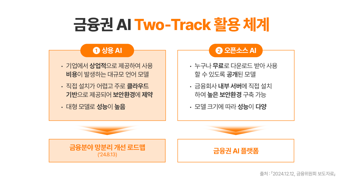 이 같은 문제를 해소하고자 금융위원회는 2024년 12월, 생성형 AI의 금융권 도입을 제도적으로 뒷받침하기 위한 「금융권 생성형 AI 활용 지원 방안」을 발표하였습니다. 이 정책의 핵심은 바로 ‘이원(Two-Track) AI 활용 체계’ 도입에 있습니다.