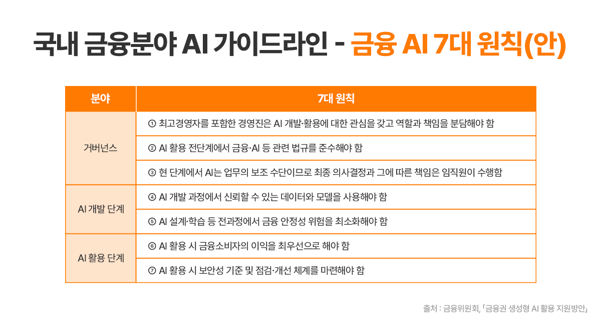 개정될 가이드라인에는 ‘금융 AI 7대 원칙’이 핵심으로 제시될 예정입니다. 이 원칙은 다음과 같은 내용을 포함합니다.