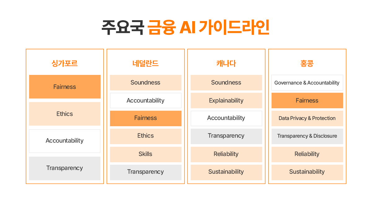 자본시장연구원의 발표에 따르면, 2024년 1분기 기준 OECD 32개국이 금융권에서 AI를 활용할 수 있도록 가이드라인을 제정했으며, 그 공통된 핵심 요소는 투명성, 공정성, 책임성, 데이터 보호, 설명 가능성 등으로 요약됩니다. 이들은 모두 AI의 생애주기 전반에서 리스크를 사전에 식별하고 제어할 수 있도록 설계된 규범들입니다.
