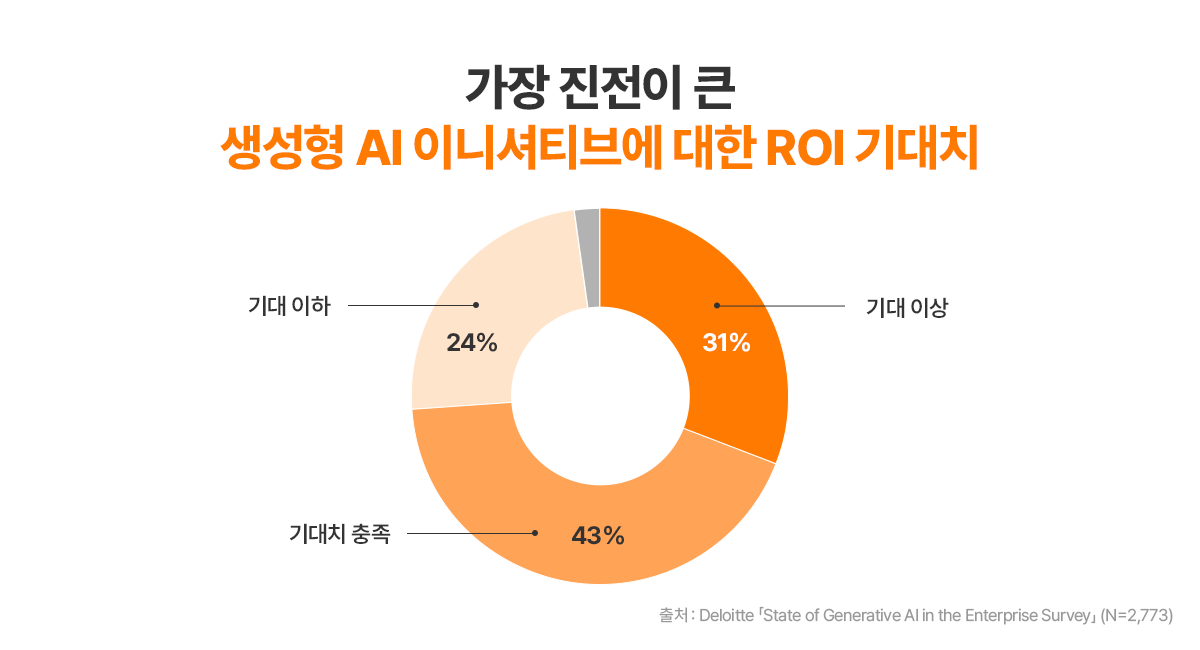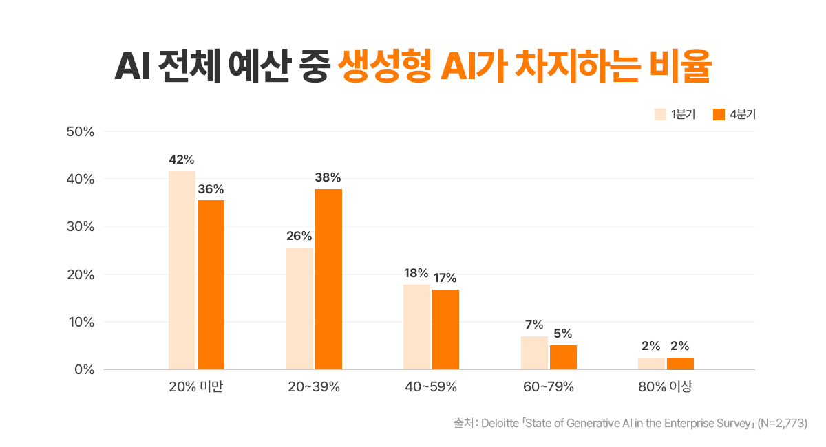 딜로이트의 최신 조사에 따르면, 응답 기업의 약 78%가 향후 회계연도에 AI 관련 지출을 늘릴 계획이며, 특히 생성형 AI가 전체 AI 예산에서 차지하는 비중도 점차 커지고 있습니다. 그만큼 생성형 AI가 단순한 기술 실험이 아닌, 기업 성과에 실질적인 영향을 주는 핵심 전략 자산으로 자리매김하고 있다는 뜻입니다.