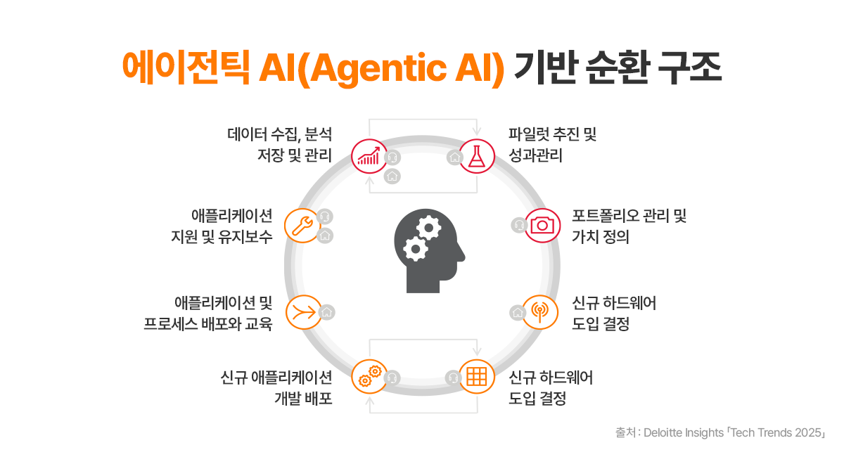 딜로이트가 제시한 에이전틱 AI 기반의 순환 구조는 이러한 변화를 잘 보여줍니다. 에이전틱 AI는 데이터 수집 및 분석부터 신규 애플리케이션의 설계, 배포, 교육, 유지보수에 이르기까지 전체 IT 운영 사이클에 걸쳐 지속적으로 개입하고 결정을 내립니다. 즉, 과거에는 인간의 판단과 승인으로만 가능했던 반복적이고 전략적인 IT 의사결정과 실행이, 이제는 AI 중심으로 자연스럽게 전환되고 있는 것입니다.