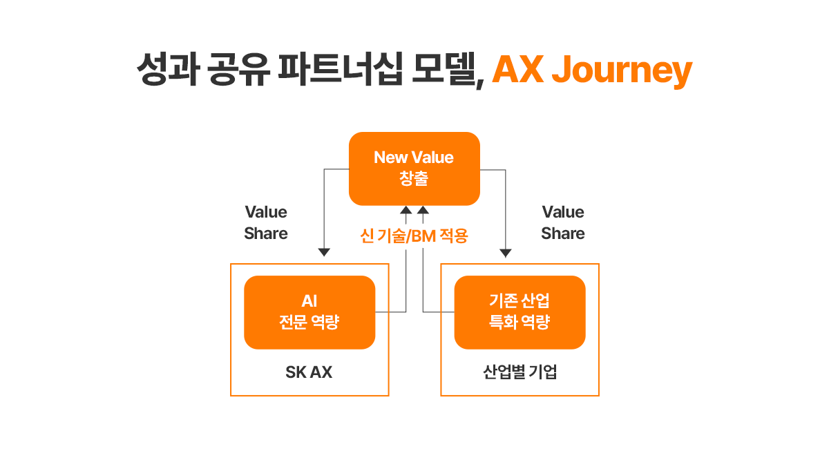 SK AX는 이러한 시장의 요구에 대응하기 위해, 성과 공유 AI 파트너십 모델인 ‘AX Journey – 성과 공유 파트너십 프로그램’을 운영하고 있습니다. 이 프로그램은 당장의 예산이 부족한 기업도 AI를 선제적으로 도입할 수 있도록 지원하며, 실제 성과가 발생한 이후 일정한 수익을 공유하는 구조로 설계되어 있습니다.
