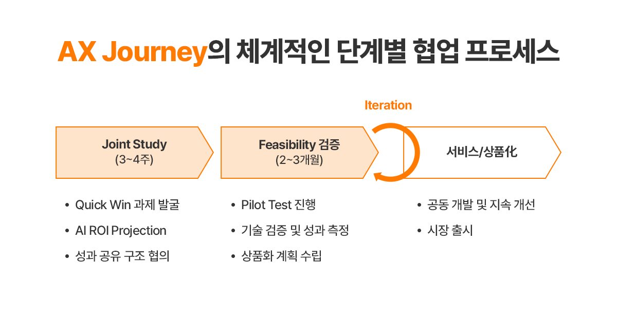 AX Journey는 이처럼 단순 기술 이전을 넘어, 기획-검증-상용화에 이르는 전 과정을 함께 설계하고 실행하는 방식으로, 고객의 내부 역량과 기술을 자연스럽게 연계시키며 AI 도입의 현실적 장벽을 낮추고 있습니다.