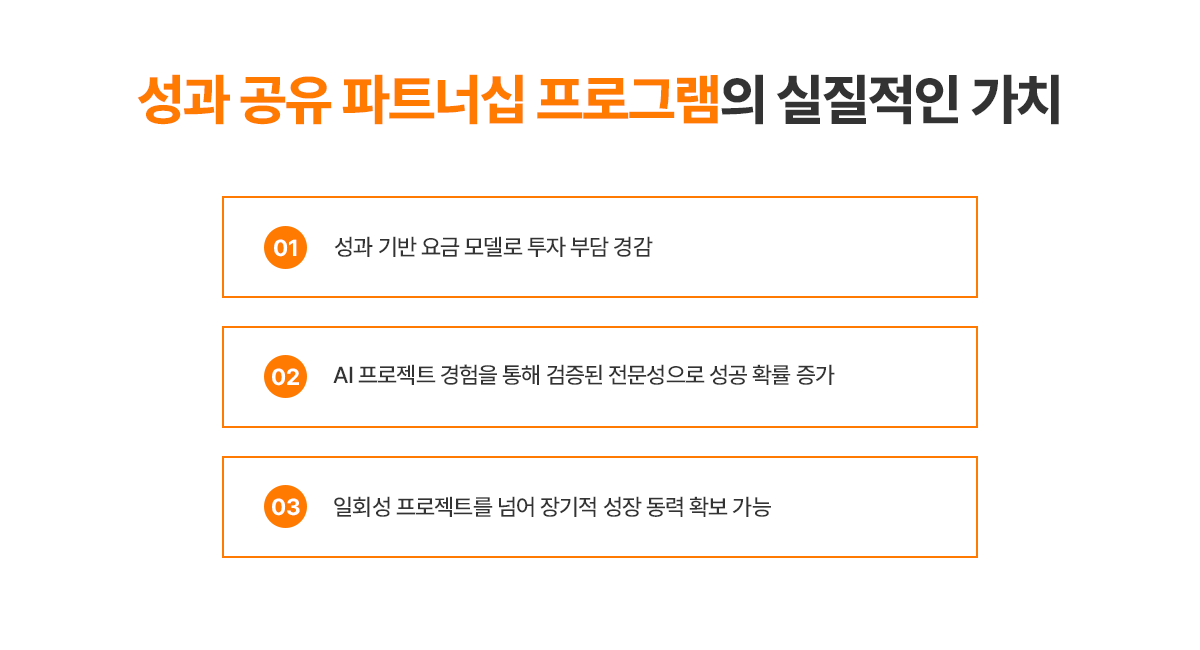 그러나 많은 기업들이 실제 도입 단계에서는 높은 초기 투자 비용, 성과에 대한 불확실성, 내부 역량 부족 등의 이유로 실행을 망설이고 있는 것이 현실입니다. 이러한 상황에서 단순히 기술을 공급하는 것을 넘어, 기업과 함께 리스크를 나누고 성과를 공유하는 새로운 형태의 파트너십이 요구되고 있습니다.