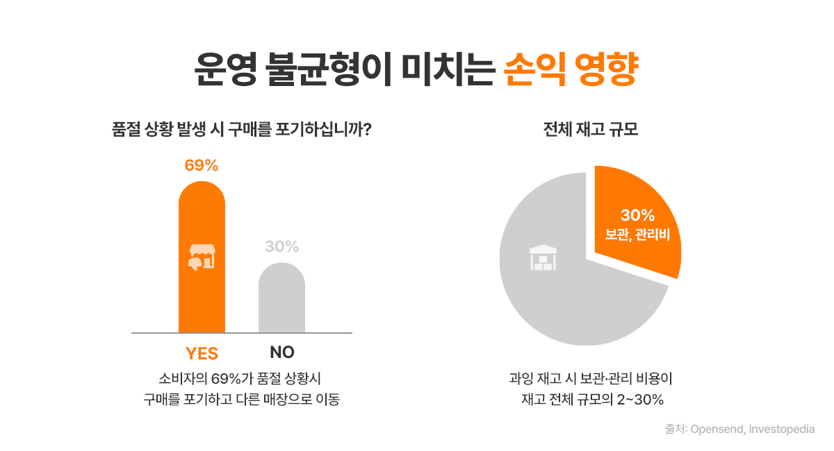 문제는 이러한 불균형이 운영상 불편에 그치지 않고 기업의 손익에 직접적인 영향을 미친다는 점입니다. 글로벌 조사에 따르면 품절 상황이 발생할 경우 소비자의 69%가 구매를 포기하고 다른 매장으로 이동한다고 합니다. 반대로 재고를 지나치게 보유할 경우 창고 임대료, 인건비, 보험료 등이 누적되어 보관·관리 비용이 전체 재고 규모의 20~30%에 달하는 것으로 나타났습니다.