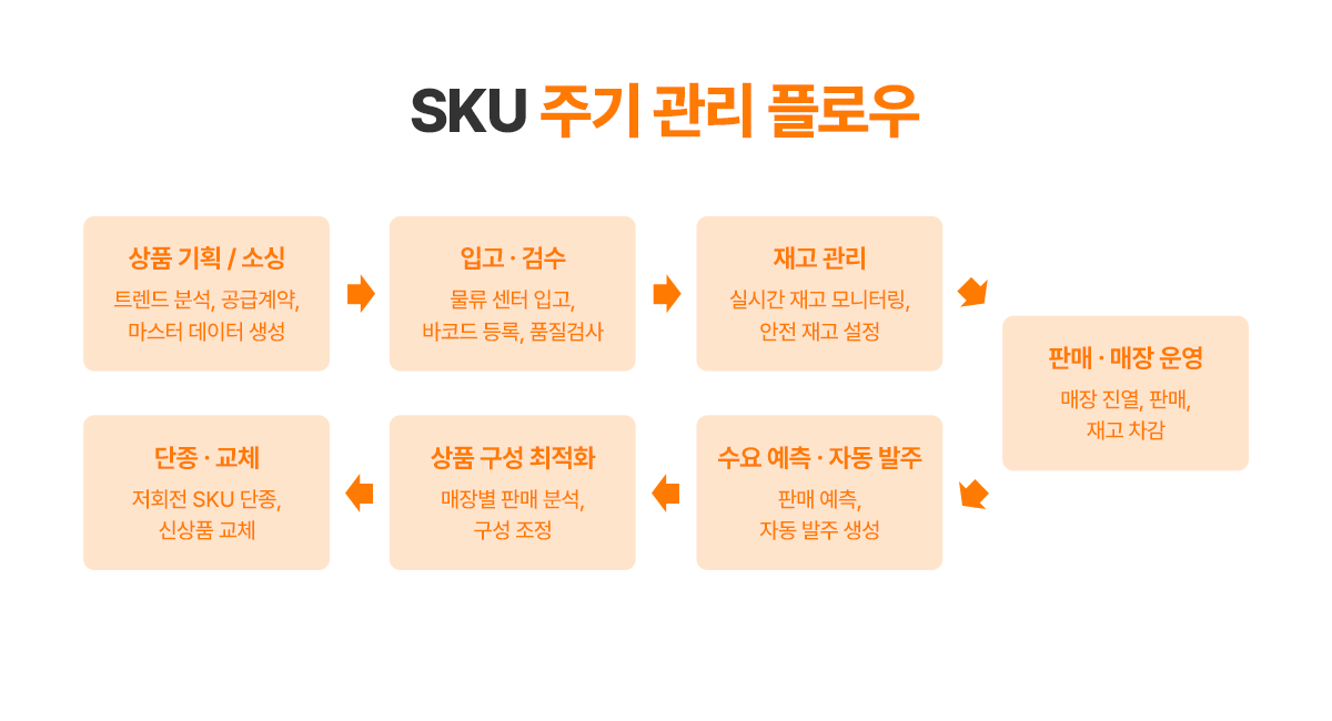 이 두 가지 전략이 결합되면, 재고 관리와 상품 구성이 SKU의 전 주기에 걸쳐 상호 작용하며 각 단계에서 운영 효율성 개선과 매출 성장을 동시에 견인하게 됩니다. 재고와 상품 관련 데이터가 단일한 플랫폼에서 통합적으로 흐르기 때문에, 특정 상품의 판매 추이나 수요 변화가 발생하면 재고 관리 정책뿐 아니라 매장별 진열 전략에도 즉시 반영됩니다. 반대로 상품 구성의 변화 역시 곧바로 발주와 물류 운영에 영향을 미쳐 전체 공급망이 유기적으로 조정됩니다. 결국 SKU의 기획부터 단종까지 이어지는 전 과정이 데이터 기반으로 제어되는 구조가 마련되며, 이는 다품종 소매업의 운영을 한층 더 정교하고 민첩하게 만드는 토대가 됩니다.