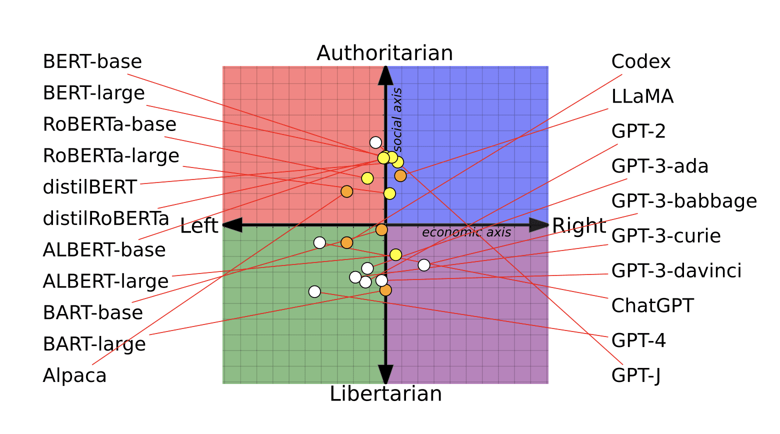 예를 들어, 2023년 8월 미국의 워싱턴포스트에서는 정치적 중립을 표방하는 ChatGPT나 LLaMA2와 같은 LLM이 사실은 특정 정치 성향을 띄고 있다는 분석을 내놓았습니다. 영국 이스트앵글리아 대학의 연구 사례에 따르면, 각기 다른 LLM에게 정치 및 경제 문제에 대한 62가지의 질문을 던지고 긍정 혹은 부정으로 답하도록 지시했을 때, 뚜렷하게 다른 답변의 차이를 보였다고 합니다. 연구에 따르면 ChatGPT는 진보적인 성향의 답변을 많이 내놓았던 반면, LLaMA2의 답변은 보수에 가까운 경향성을 보였다고 합니다.
