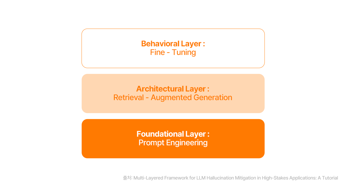 그렇다면 이처럼 고질적인 할루시네이션 문제를 해결하기 위해 현업 AI 엔지니어들은 어떤 방법을 모색하고 있을까요? LLM 자체의 구조를 바꾸는 연구도 활발하지만, 현재 가장 효과적으로 사용되는 방법들은 대부분 LLM의 외부에 안전장치를 마련하는 방식입니다. 할루시네이션 방지를 위한 대표적인 세 가지 방법론에 대해 소개하도록 하겠습니다.