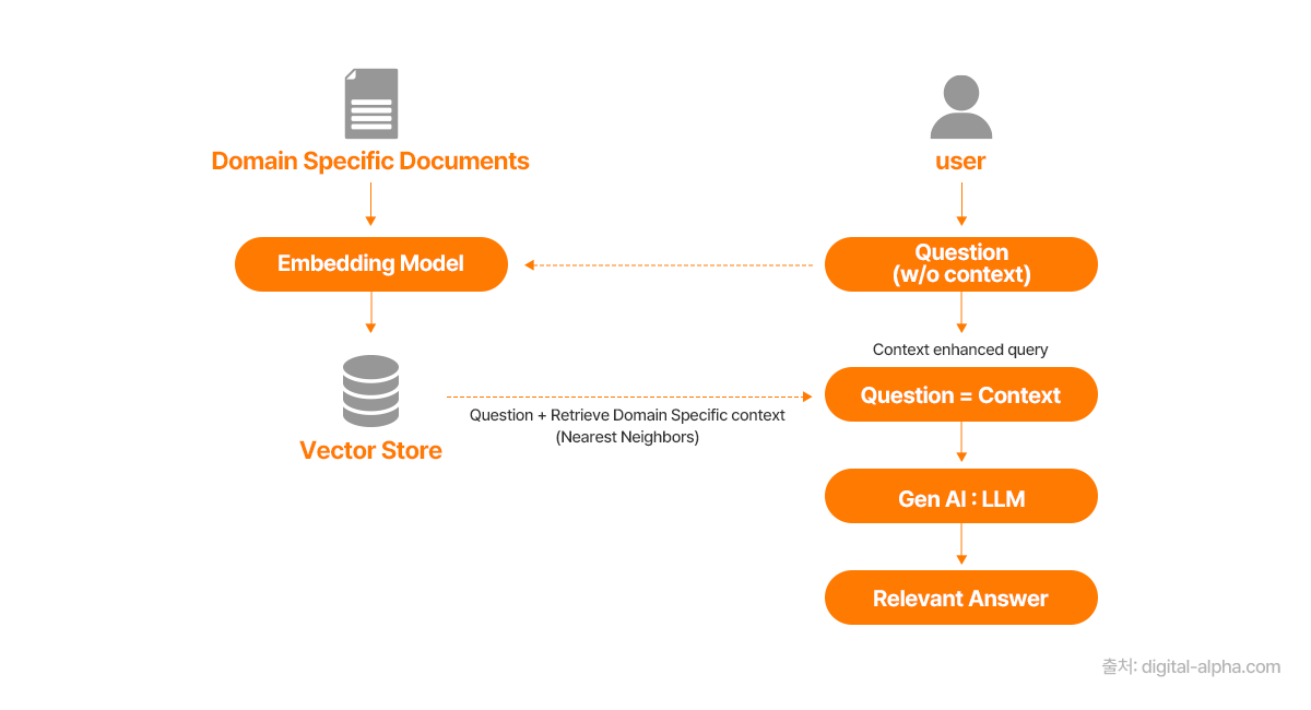 예를 들어, 특정 회사의 내부 문서에 대한 질문을 LLM에 던질 때, RAG 시스템은 먼저 이 내부 문서들을 검색하여 질문과 관련된 정보를 찾아냅니다. 그리고 찾아낸 정보를 LLM에 입력하여 제공하며, LLM이 해당 정보를 기반으로 답변을 생성하도록 유도합니다. 이를 통해, LLM이 학습 데이터에 없는 최신 정보나 특정 도메인의 전문적인 정보를 다루면서도 할루시네이션을 줄일 수 있습니다. RAG는 LLM의 지식 범위를 확장하고 정확성을 높이는 효과적인 기술로 평가받습니다.