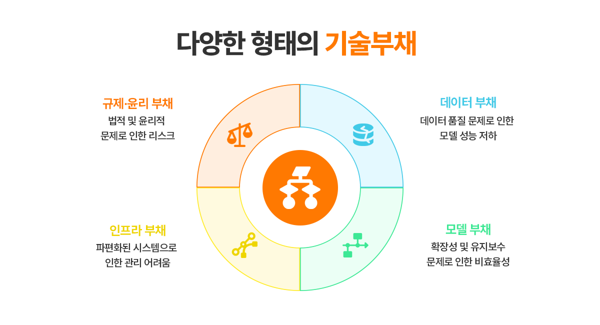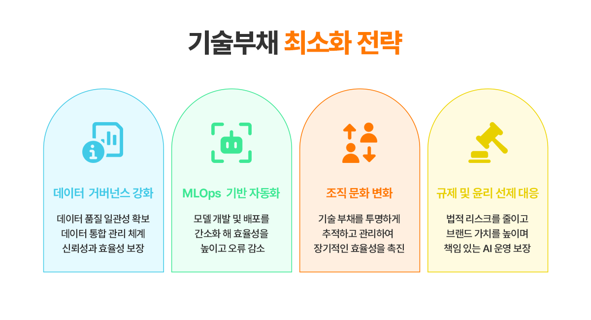 또한 기술 부채는 데이터, 모델, 인프라, 규제·윤리 등 여러 영역에서 발생하며, 그 특성과 파급력이 상이합니다. 잘못된 값이나 편향된 데이터는 모델 성능을 무너뜨리고, 급히 만들어진 모델은 재사용과 확장에 한계를 드러냅니다. 부서마다 다른 시스템을 운영하면 관리 비용이 기하급수적으로 늘어나고, 개인정보 보호나 투명성 확보를 미룬 결과는 규제 위반과 사회적 논란으로 이어질 수 있습니다. 이처럼 기술 부채는 형태는 달라도 공통적으로 기업의 민첩성과 신뢰를 떨어뜨리며, 장기적으로는 성장 자체를 저해하는 요인으로 작용합니다.