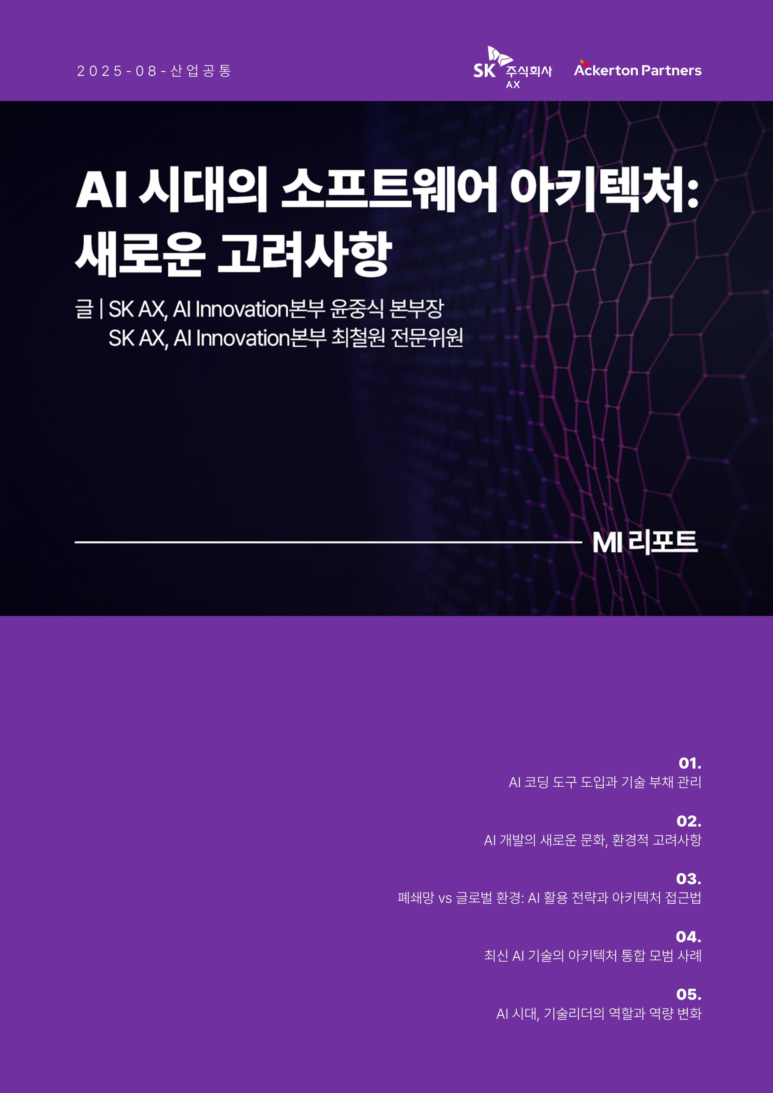 AI 시대의 기술 부채는 단순히 코드의 품질 문제가 아니라 기업 전체의 전략적 리스크입니다. 이를 방치하면 빠른 혁신이 오히려 위기로 돌아올 수 있습니다. 기술 부채 관리와 선제적 대응은 선택이 아닌 필수이며, AI 도입의 성패를 좌우하는 핵심 요소가 됩니다. 결국 AI 시대를 성공적으로 준비하는 조직은 기술 부채를 인식하고 체계적으로 관리하는 조직입니다. 이에 대한 더 자세한 이야기는 SK AX의 MI 리포트를 통해 확인하실 수 있습니다.