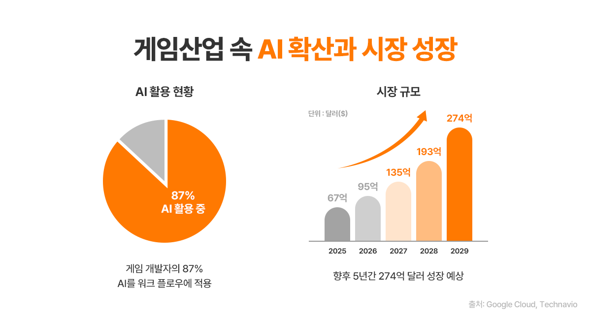 최근 글로벌 조사에 따르면 게임 개발자의 87% 이상이 이미 AI를 워크플로우에 적용하고 있는 것으로 나타났습니다. 반복적인 코딩과 QA 테스트 같은 업무는 AI가 대신 처리하는 수준에 이르렀으며, 개발자는 창의적 기획과 전략적 의사결정에 더 많은 시간을 쓸 수 있게 되었습니다. 동시에 게이머들 또한 정해진 스토리와 제한된 NPC 대사에 머무르지 않고, 상황에 따라 달라지는 스토리와 개인화된 경험을 기대하게 되었습니다.