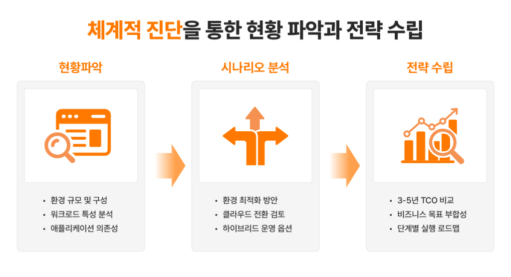 이를 바탕으로 다양한 시나리오별 분석이 가능합니다. 현 환경을 유지하면서 최적화하는 방안, 클라우드로 전환하는 방안, 하이브리드 형태로 운영하는 방안 등 각 옵션에 대한 3~5년 관점의 TCO를 비교하고, 비즈니스 목표와 기술 전략에 가장 부합하는 방향을 도출할 수 있습니다.