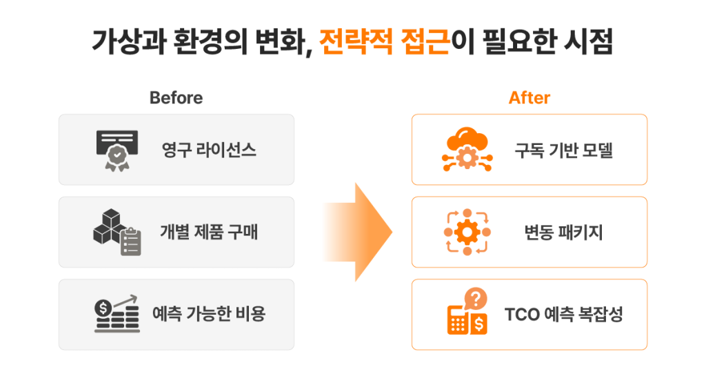 이러한 변화는 단순히 라이선스 구매 방식의 전환을 넘어서는 의미를 갖습니다. 구독 기반 비용 구조로의 전환, 번들 정책에 따른 TCO(총소유비용) 예측의 복잡성 증가, 기술 지원 채널의 재편 등은 기업의 IT 환경 운영 전반에 영향을 미치고 있습니다. 많은 IT 담당자들이 “우리 환경은 어떤 영향을 받게 될까?”, “어떤 준비가 필요할까?” 같은 질문을 하고 있지만, 막상 현재 상황을 정확히 파악하고 대응 전략을 수립하기는 쉽지 않습니다.