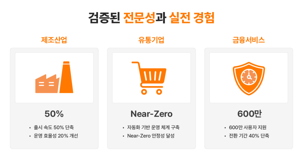 실제 사례를 보면, 글로벌 제조 기업은 클라우드 전환을 통해 해외 시장 출시 속도를 50% 단축하고 글로벌 IT 운영 효율성을 20% 개선했습니다. 대형 유통 기업은 자동화 기반 운영 체계를 구축하여 Near-Zero 수준의 안정성을 달성했으며, 금융 서비스 기업은 600만 사용자를 지원하는 시스템을 기존 대비 40% 단축된 기간에 성공적으로 전환했습니다.