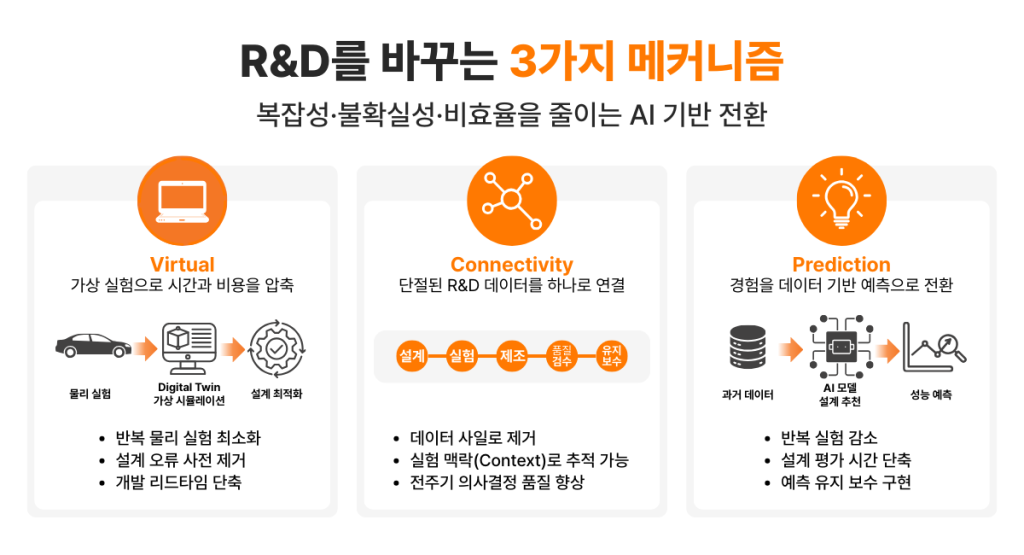 글로벌 선도 기업들이 R&D에 AI를 적용하는 방식을 분석해 보면, 크게 세 가지 핵심 메커니즘으로 구분할 수 있습니다. 이는 Virtual(가상화), Connectivity(연결성), Prediction(예측·최적화)이라는 세 축으로, 각각이 연구개발의 근본적인 비효율을 해소하는 역할을 합니다.