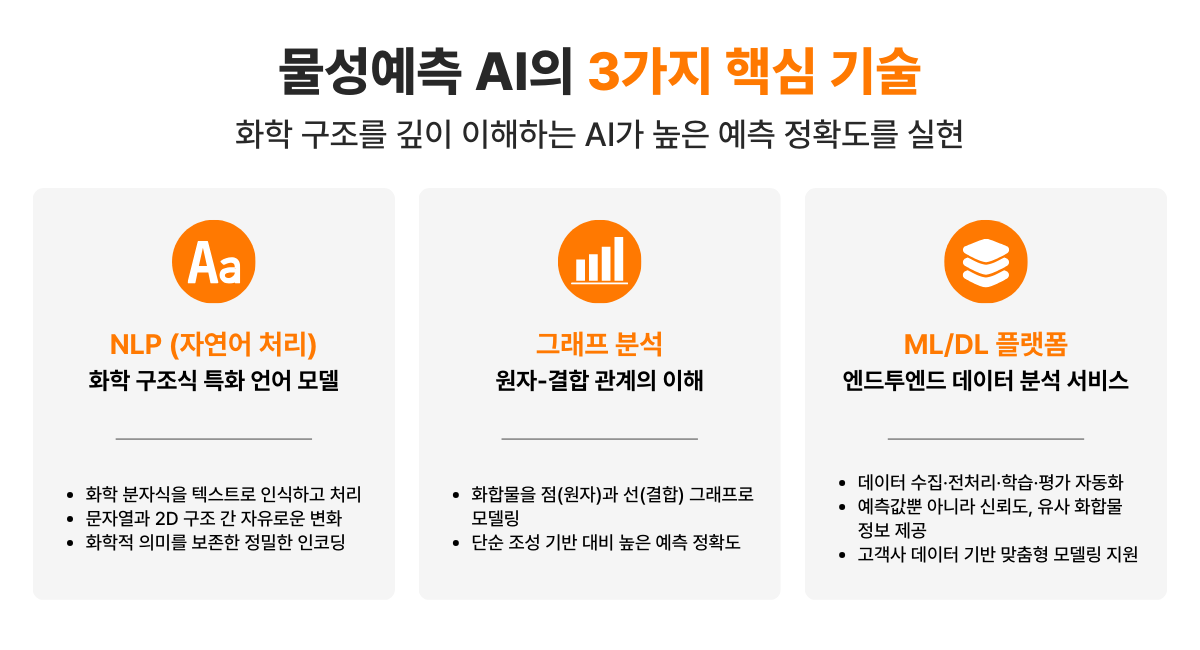물성예측 AI가 높은 예측 정확도를 달성할 수 있는 배경에는 세 가지 핵심 기술이 있습니다.